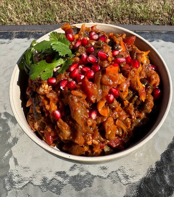 Ingredients: Oil, onion, bell pepper, fried eggplants, garlic, red pepper, cilantro, parsley, tomatoes