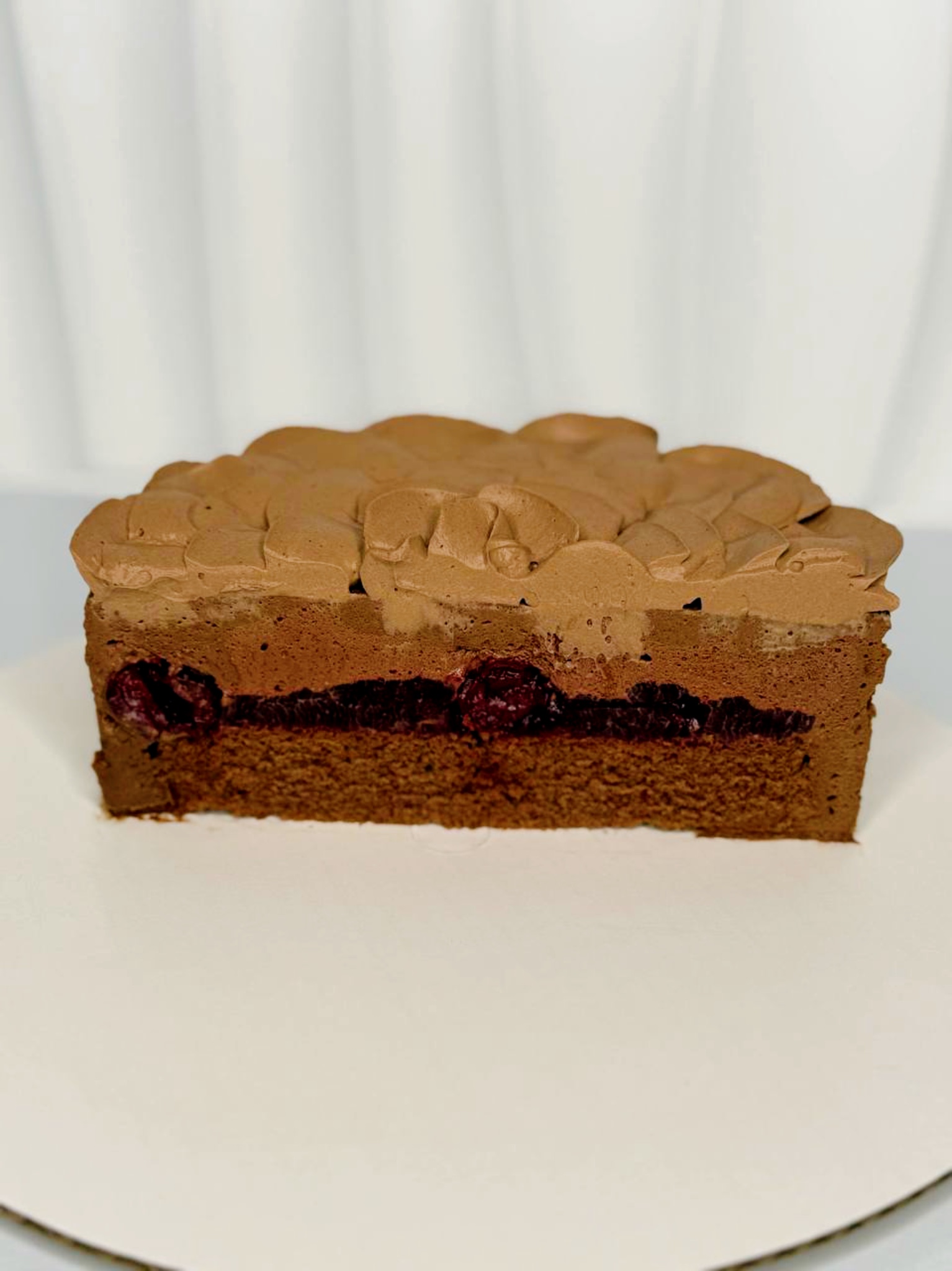 Black Forest Cake A classic cake that brings true delight to connoisseurs of exquisite taste! Moist gluten-free chocolate sponge is infused with rich cocoa aroma, creating the perfect foundation for juicy cherry coulis with natural berries. Delicate chocolate-cherry crème melts on your tongue, revealing a rich palette of flavors from sweet chocolate to tangy cherry tartness. The composition is completed with refined dark chocolate ganache, which adds elegance and depth of flavor to the dessert.