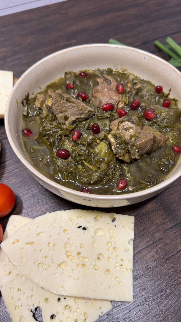 Ingredients: Lamb stewed with cilantro, green onions, tarragon, mint, tkemali sauce, dry white wine