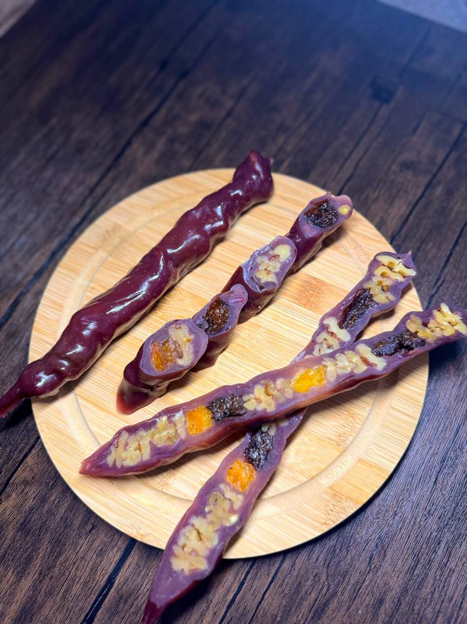 Traditional Georgian Churchkhela – a natural energy snack made from walnuts, prunes, and dried apricots, coated in thickened grape juice. A perfect balance of sweet and nutty flavors!